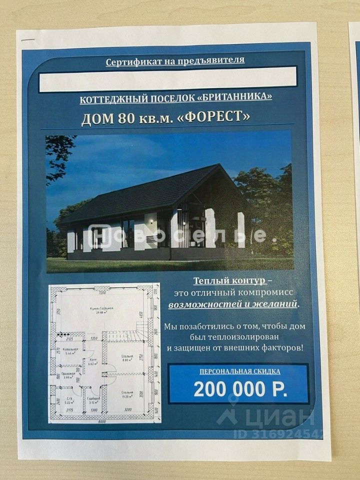 Сообщите специалисту номер объекта! 946138 Приглашаем вас окунуться в атмосферу уюта и гармонии уникального коттеджа площадью 100 м², расположенного в прекраснейшем загородном поселке ''Британника'', всего лишь в 10 км от городской суеты, окружённом густым зелёным ковром хвойного леса и зеркальной гладью живописных водоемов. Этот особенный мир идеально подходит для жизни всей семьи — здесь созданы идеальные условия для активного досуга и спокойного отдыха детей всех возрастов благодаря благоустроенным спортивным площадкам, детским зонам, ухоженному парку и чистейшему пляжу. Обеспечивая вашу безопасность и комфорт круглосуточно работает профессиональная служба охраны и квалифицированная управляющая компания. Ваш новый дом возведён из современных экологичных материалов, прочных газобетонных блоков, оборудован всеми удобствами современной цивилизации: электричество, водоснабжение, газификация и высокоскоростной интернет обеспечат комфорт и удобство каждому члену семьи. Внутри вас ждут три светлые и комфортные спальни, объединённая просторная гостиная-кухня, два гигиенично обустроенных санузла, просторное техническое помещение и широкая застекленная веранда, откуда открывается великолепный вид на природу. Можете так же заказать у нас дизайн и внутреннюю отделку дома. Качественная внутренняя отделка подарит ощущение тепла и домашнего уюта сразу же после переезда: ровные поверхности стен и пола, установленные энергосберегающие окна-тройники и современные двери создадут приятное впечатление комфорта и заботы о будущих жильцах. Мы готовы предложить индивидуальную помощь в оформлении ипотечного кредита, включая льготную семейную ипотеку с выгодной процентной ставкой всего 6%, обеспечивая прозрачность сделки и полную правовую поддержку на каждом этапе оформления документов. Представлен один из нескольких вариантов проектов домов в коттеджном поселке ''Британника''.Это предложение ждёт именно вас — не пропустите возможность стать обладателем своего уголка природы и создать идеальное пространство для жизни своей семьи! Число предложений ограниченно — торопитесь воплотить свою мечту в реальность! Счастливой покупки! Ждем на просмотр!
