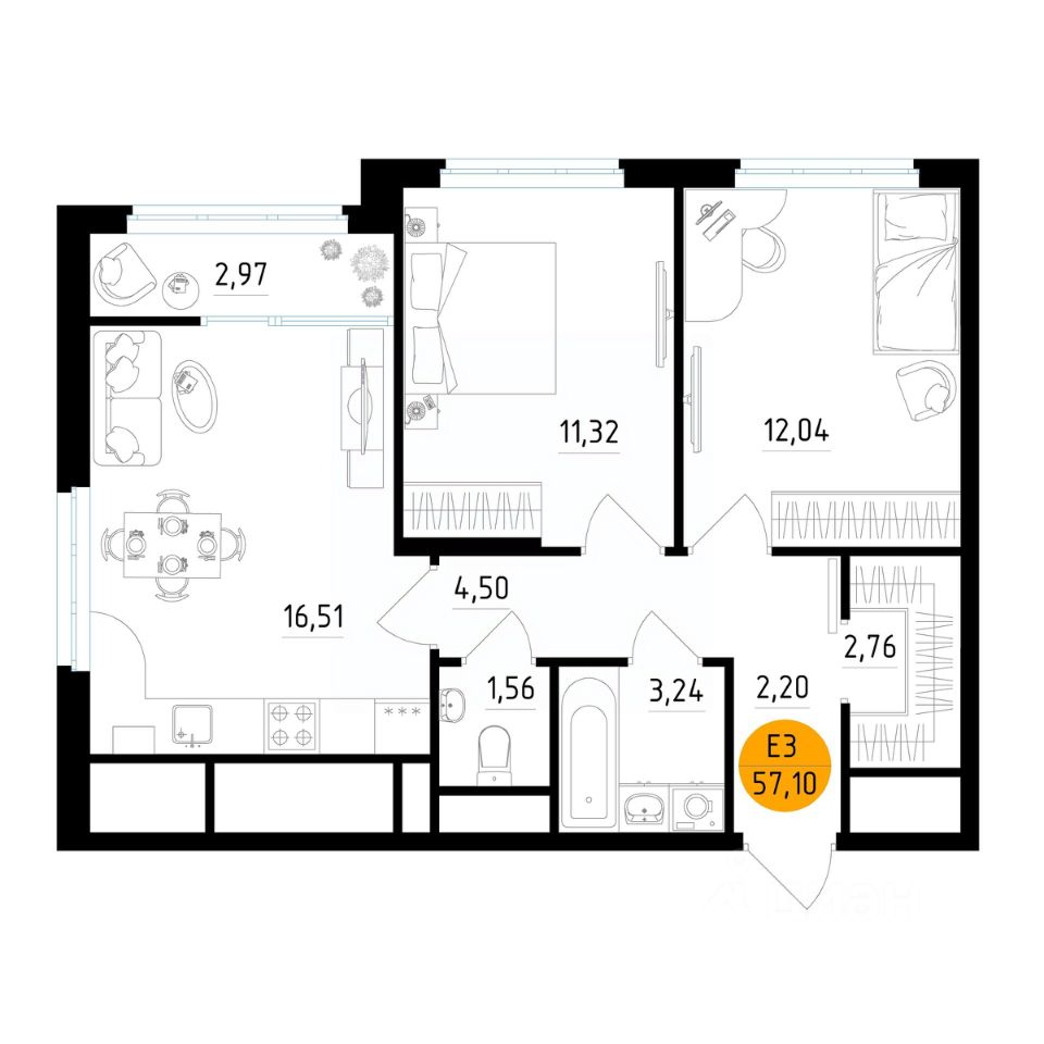 57 м² · Этаж 22 из 25