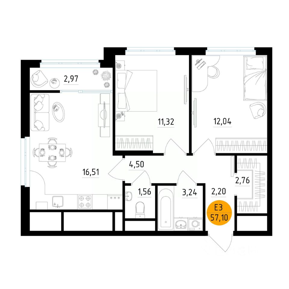 Общая площадь57,1 м2