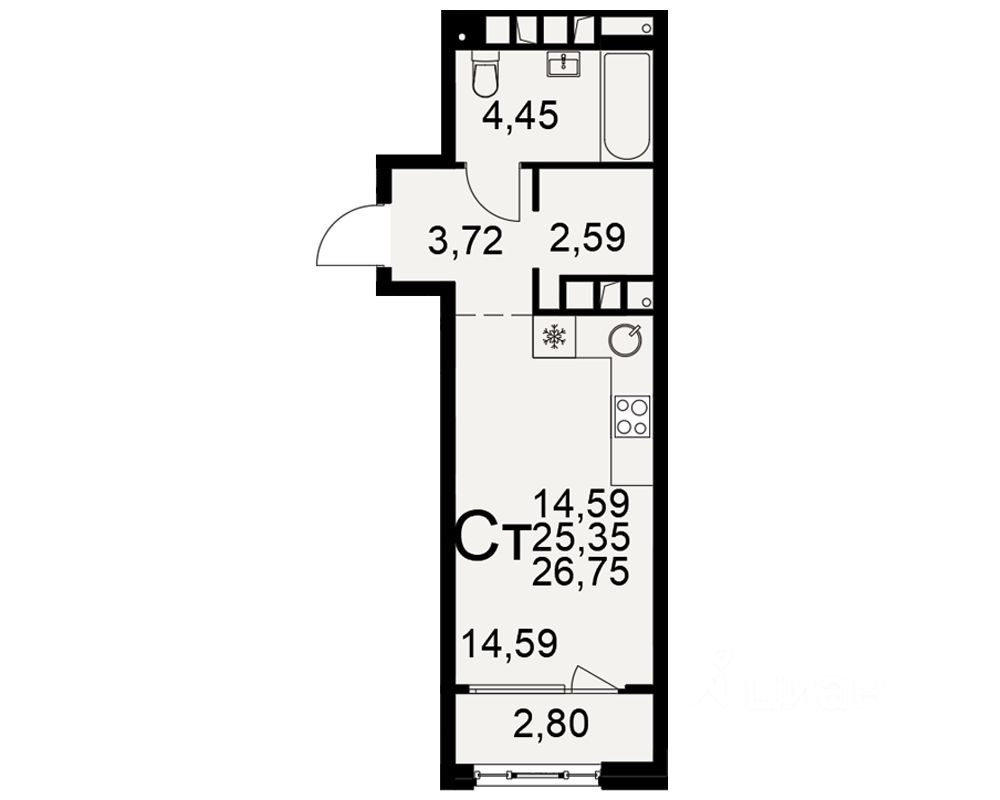 Общая площадь25,35 м2