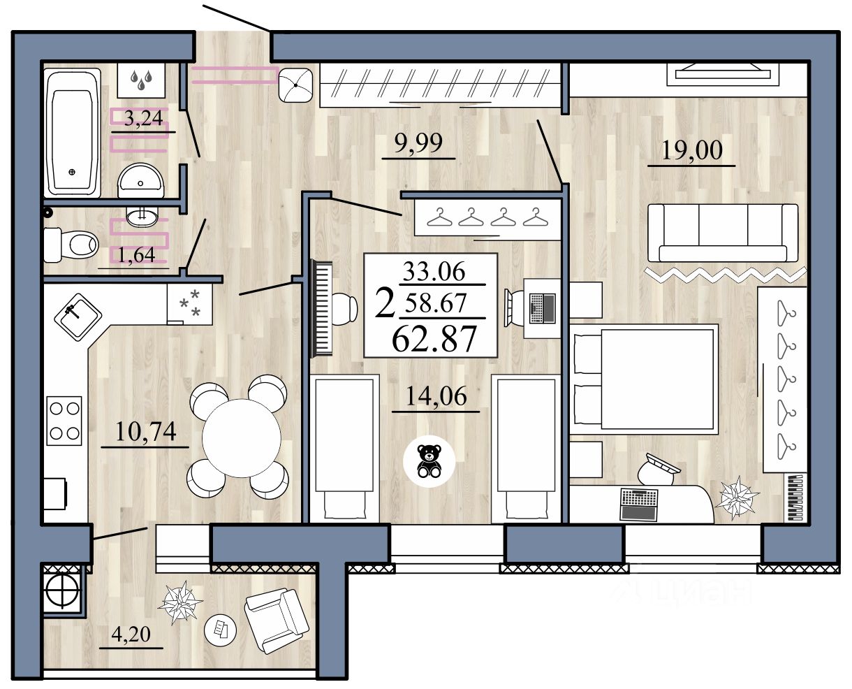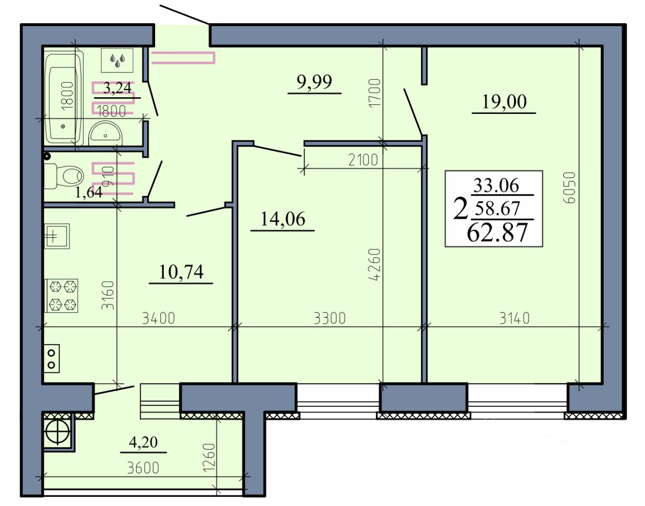 Общая площадь62,87 м2