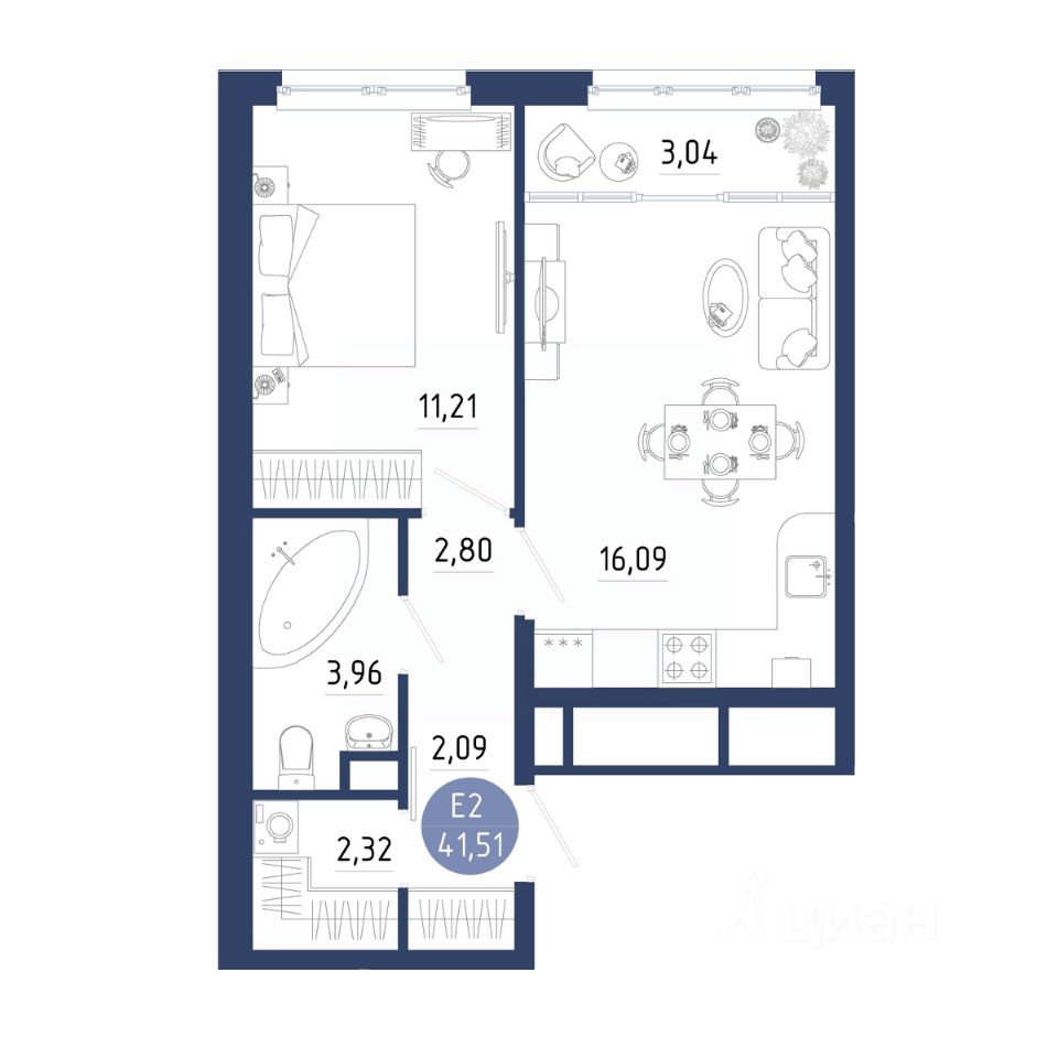 Общая площадь41,51 м2