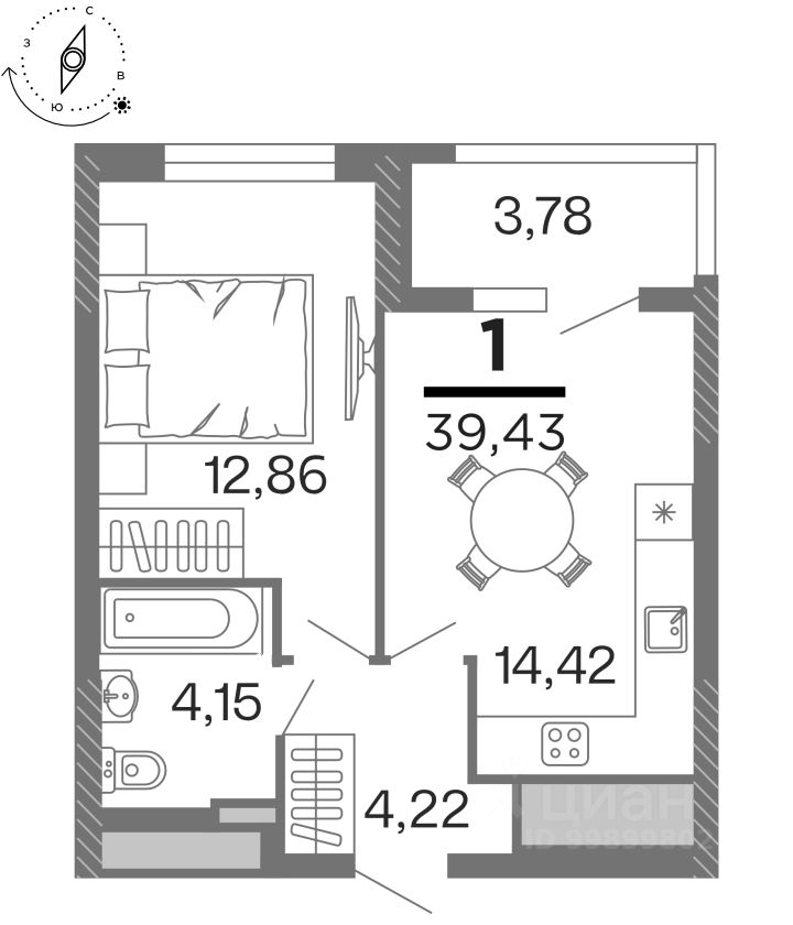 Общая площадь39,43 м2