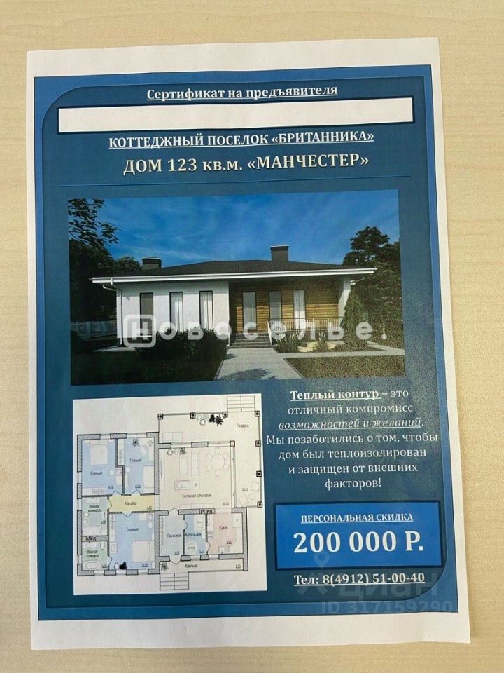 Сообщите специалисту номер объекта! 950305 Приглашаем вас окунуться в атмосферу уюта и гармонии уникального коттеджа площадью 100 м², расположенного в прекраснейшем загородном поселке ''Британника'', всего лишь в 10 км от городской суеты, окружённом густым зелёным ковром хвойного леса и зеркальной гладью живописных водоемов. Этот особенный мир идеально подходит для жизни всей семьи — здесь созданы идеальные условия для активного досуга и спокойного отдыха детей всех возрастов благодаря благоустроенным спортивным площадкам, детским зонам, ухоженному парку и чистейшему пляжу. Обеспечивая вашу безопасность и комфорт круглосуточно работает профессиональная служба охраны и квалифицированная управляющая компания. Ваш новый дом возведён из современных экологичных материалов, прочных газобетонных блоков, оборудован всеми удобствами современной цивилизации: электричество, водоснабжение, газификация и высокоскоростной интернет обеспечат комфорт и удобство каждому члену семьи. Внутри вас ждут три светлые и комфортные спальни, объединённая просторная гостиная-кухня, два гигиенично обустроенных санузла, просторное техническое помещение и широкая застекленная веранда, откуда открывается великолепный вид на природу. Можете так же заказать у нас дизайн и внутреннюю отделку дома. Качественная внутренняя отделка подарит ощущение тепла и домашнего уюта сразу же после переезда: ровные поверхности стен и пола, установленные энергосберегающие окна-тройники и современные двери создадут приятное впечатление комфорта и заботы о будущих жильцах. Мы готовы предложить индивидуальную помощь в оформлении ипотечного кредита, включая льготную семейную ипотеку с выгодной процентной ставкой всего 6%, обеспечивая прозрачность сделки и полную правовую поддержку на каждом этапе оформления документов. Представлен один из нескольких вариантов проектов домов в коттеджном поселке ''Британника''. Это предложение ждёт именно вас — не пропустите возможность стать обладателем своего уголка природы и создать идеальное пространство для жизни своей семьи! Число предложений ограниченно — торопитесь воплотить свою мечту в реальность! Ждем на просмотр!
