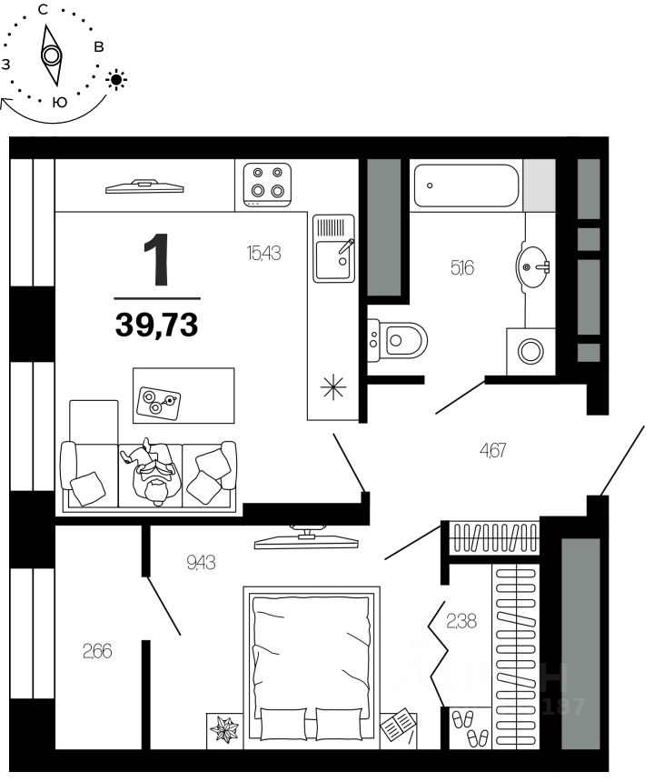 Общая площадь39,73 м2