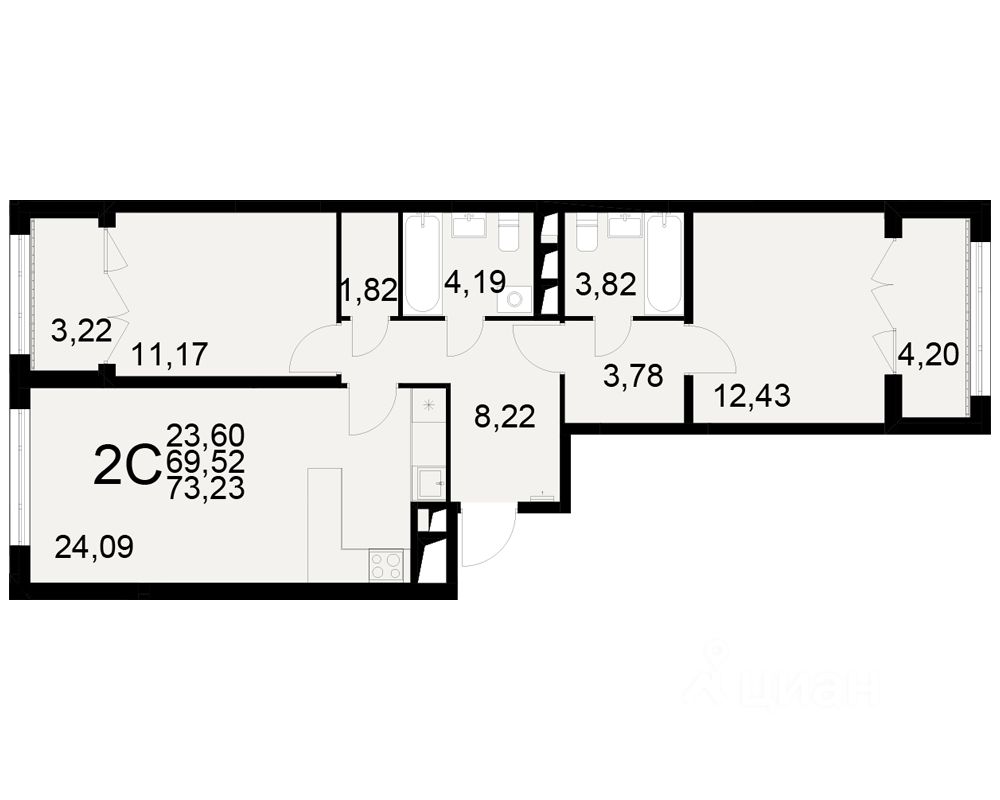 Общая площадь69,52 м2