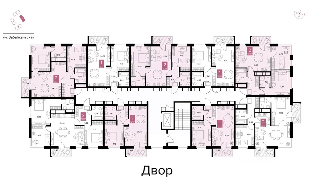 4 дома по 9 этажей, 98 парковочных мест, 29 квартир с личными террасами, Дизайнерские входные группы, Сквозные входные группы, Ландшафтный двор с зонами отдыха и игр, Индивидуальное отопление.