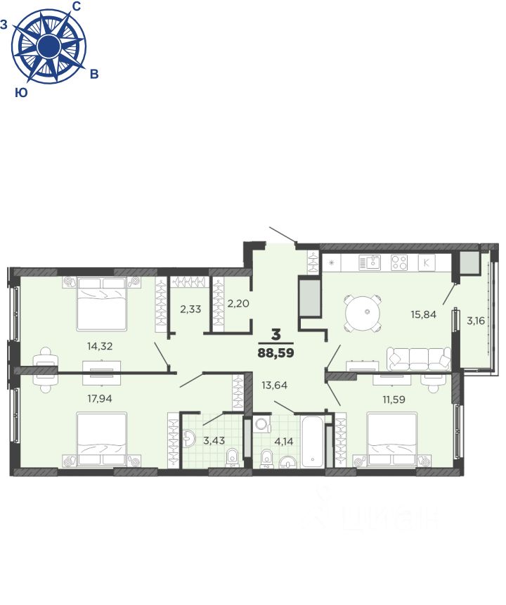 Общая площадь88,59 м2