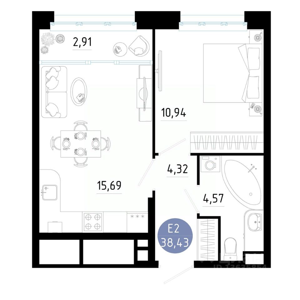 Общая площадь38,43 м2