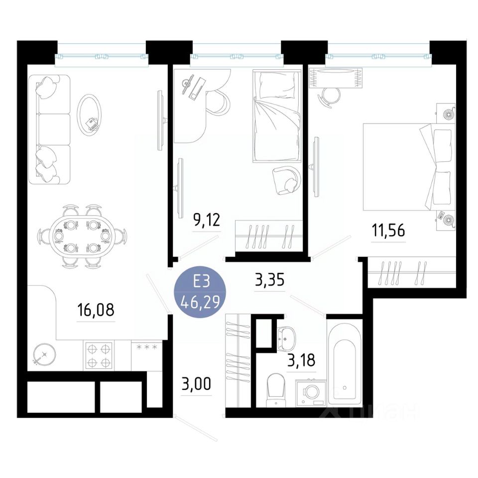 Общая площадь46,29 м2