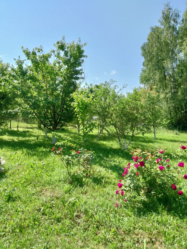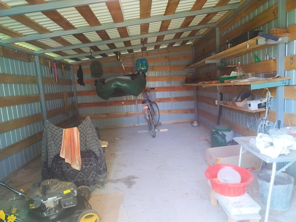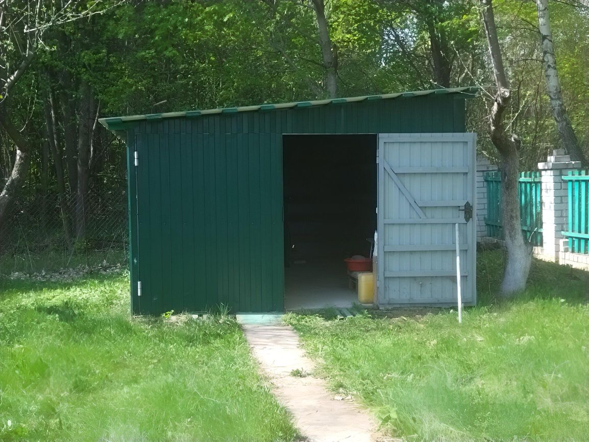Участок 18,5 соток, квадратный. Металлический гараж. На участке плодовые деревья и кустарники, газон и цветы.