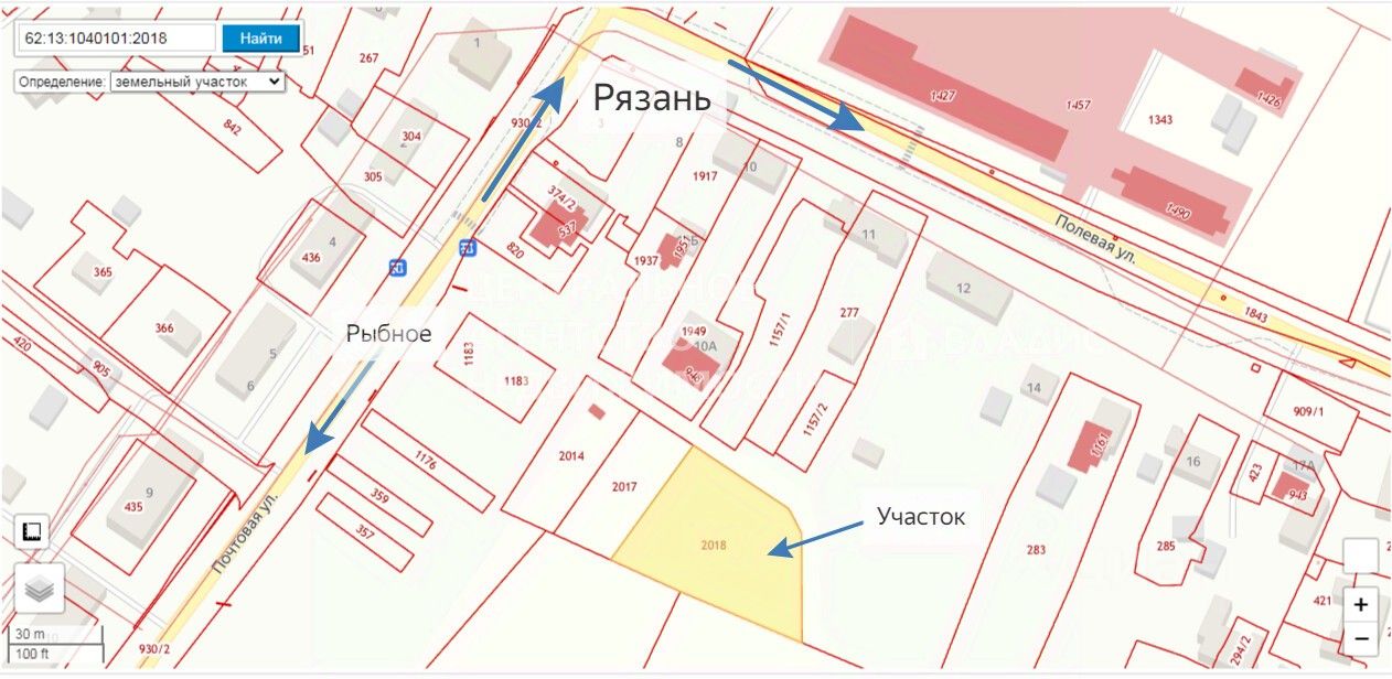 Земельный участок общей площадью 20 соток (ширина 40 м, длина 44 м), коммуникации - свет, газ по границе участка. Кадастровый номер участка 62:13:1040101:2018. Есть возможность разделить участок по 10 соток.