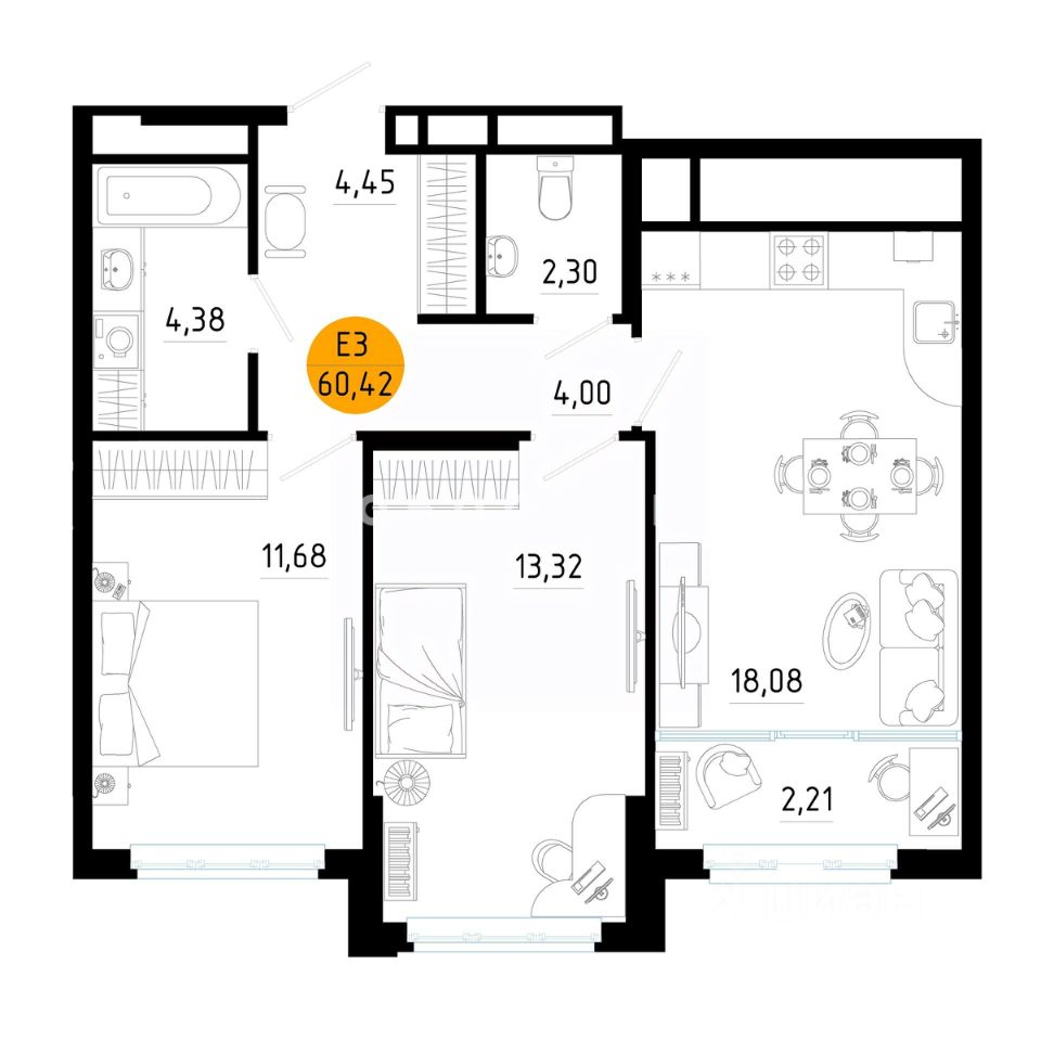 Жилая: 25 м², кухня-гостиная: 20,29 м², комната 1: 11,68 м², комната 2: 13,32 м², прихожая: 8,45 м², санузел: 4,38 м², санузел 2: 2,3 м² Высокие потолки в сочетании с панорамными окнами наполняют комнаты воздухом и светом. Индивидуальное поквартирное отопление, котёл в рабочей зоне кухни, приточно-вентиляционные клапаны, для проветривания помещения без необходимости открывать окна. Стоимость квартиры указана без цены дизайна, ремонта, мебели и бытовой техники.