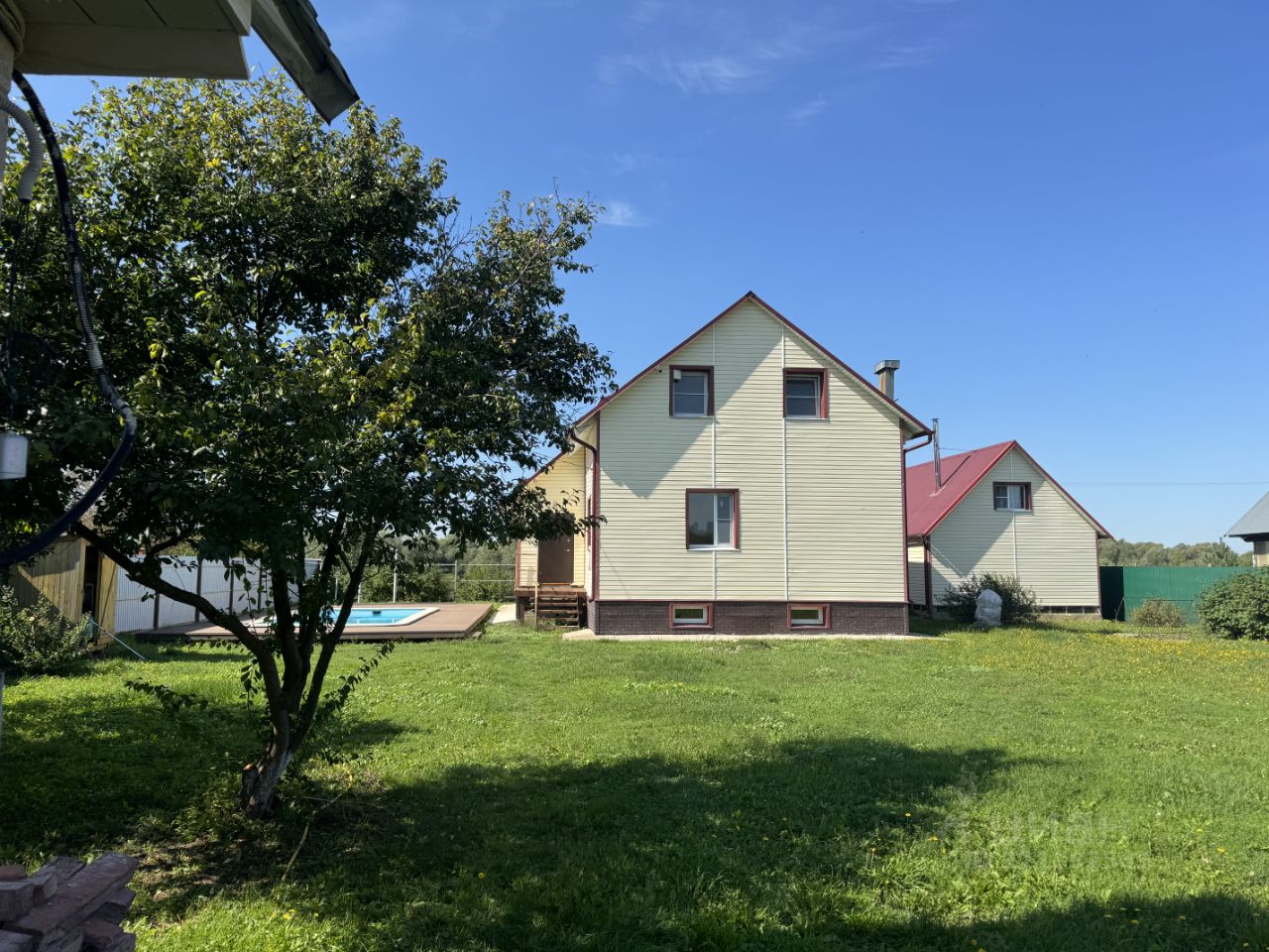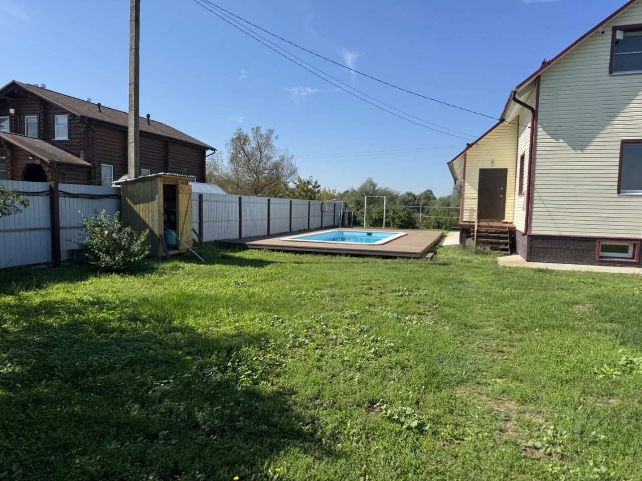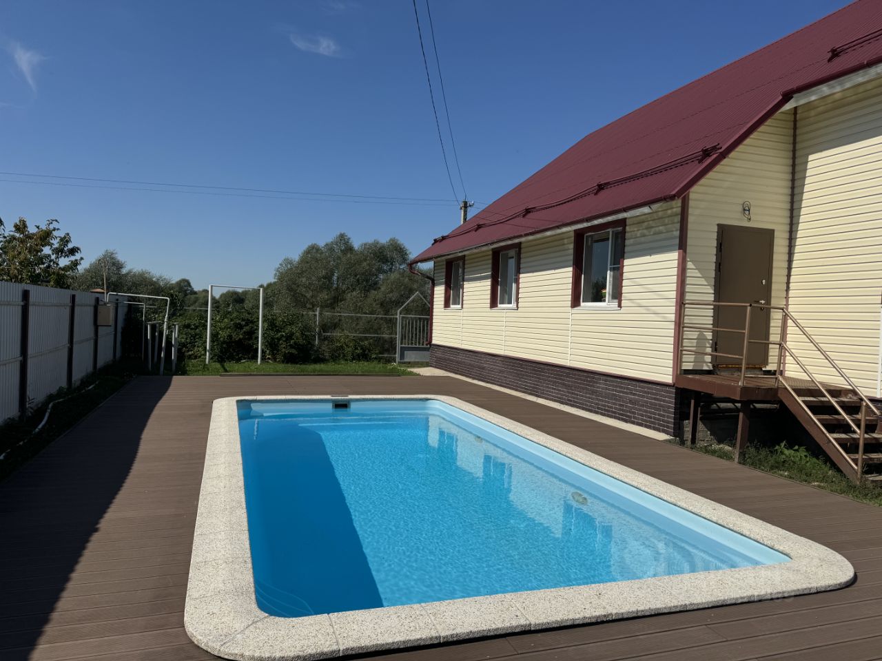 Композитный бассейн Franmer Drammen (актуальная цена изготовления только чаши 1,5 млн. руб.) размером 7,5х3,5 метра, переменной глубины от 1,3 до 1,85 метра, с автономной системой очистки и подогревом! Капитальная конструкция зоны отдыха вокруг бассейна, покрытая декингом!