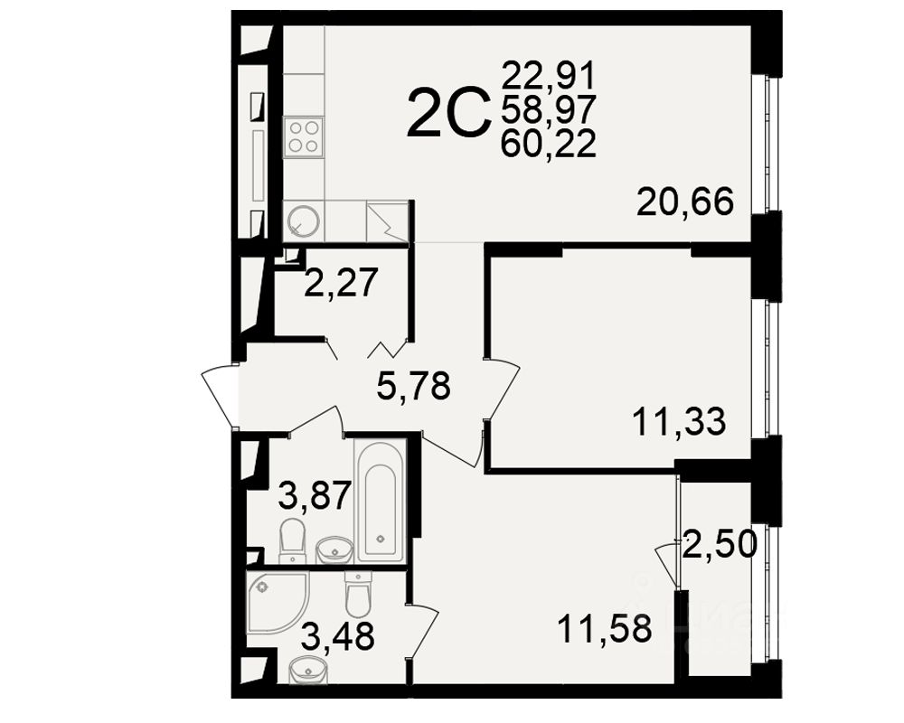 Общая площадь58,97 м2