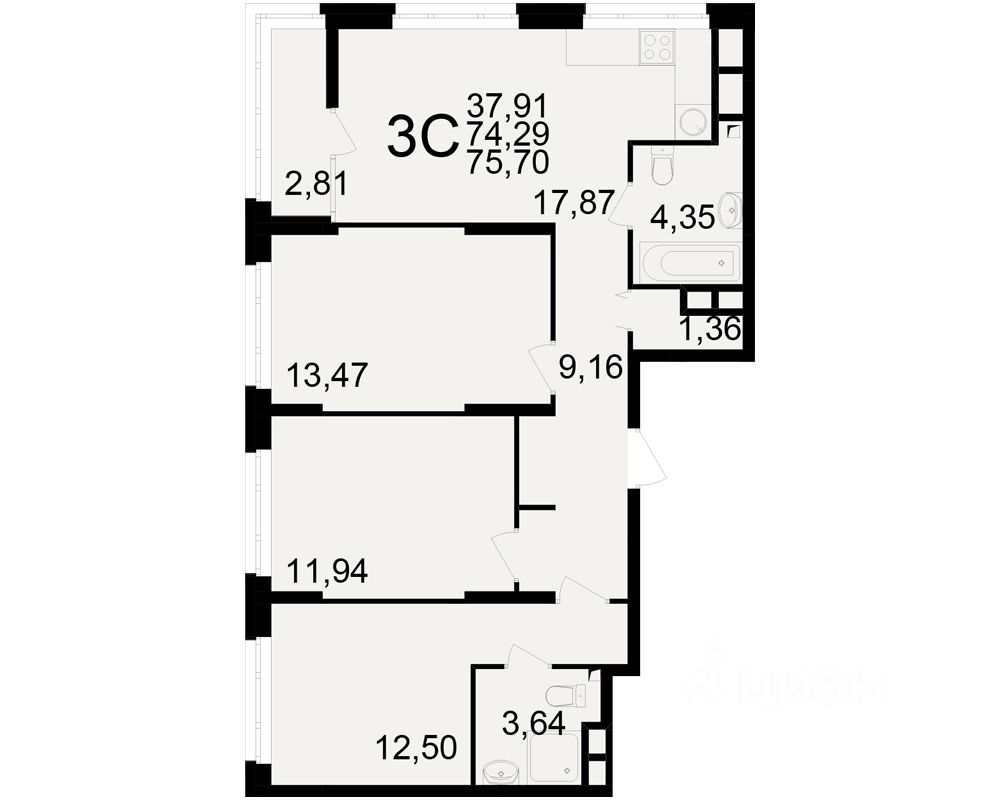 Общая площадь74,29 м2