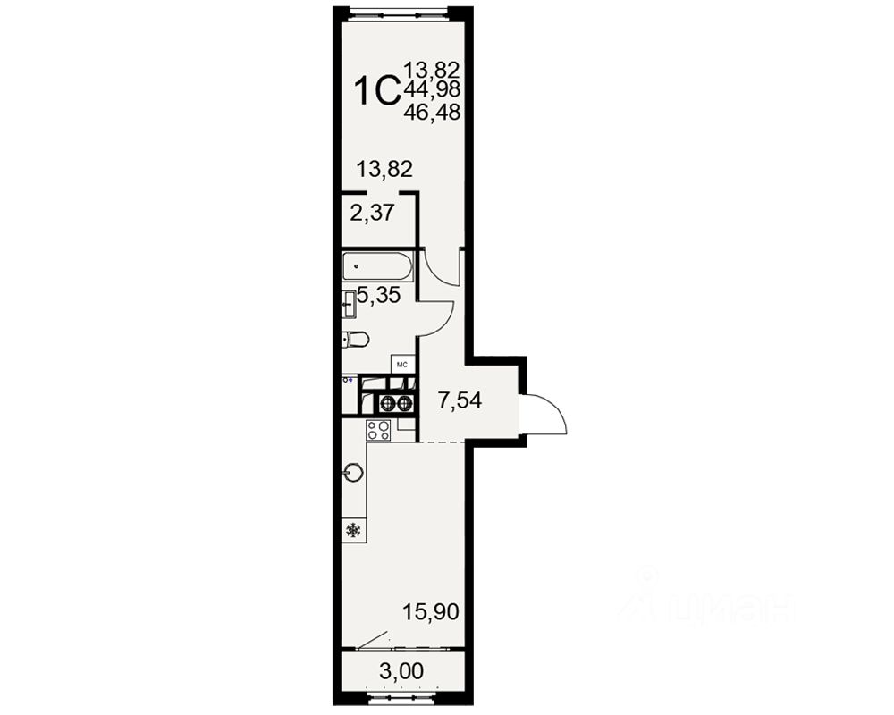 Общая площадь44,98 м2