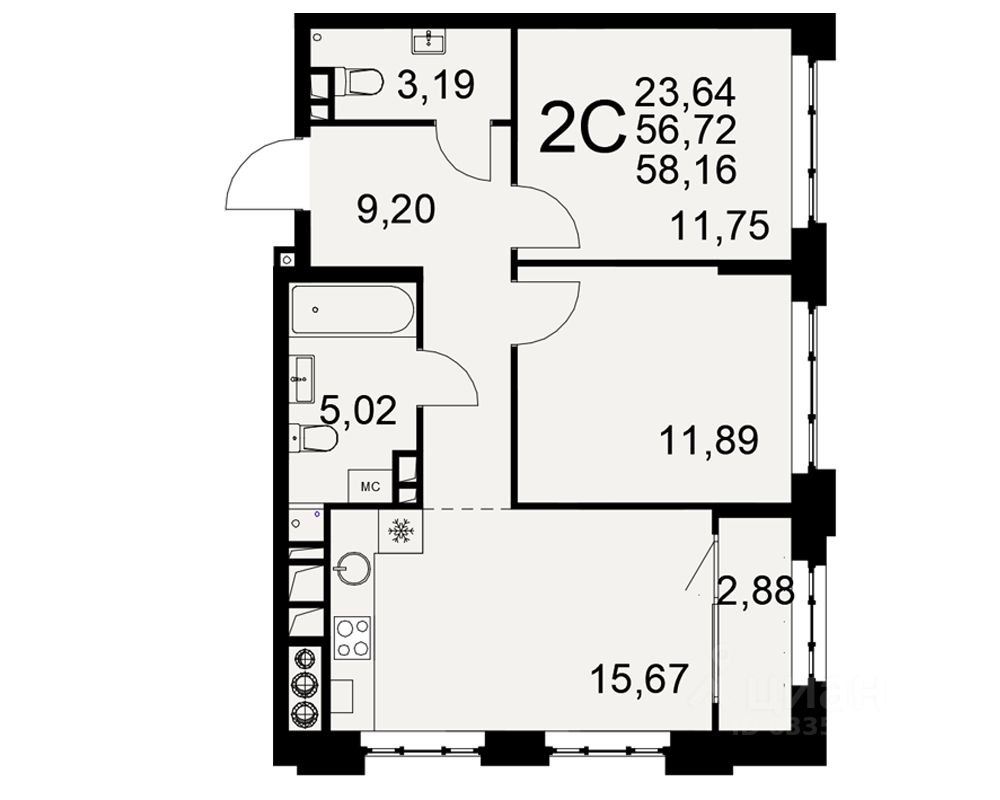 Общая площадь56,72 м2