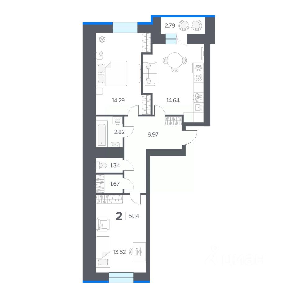 Общая площадь61,14 м2