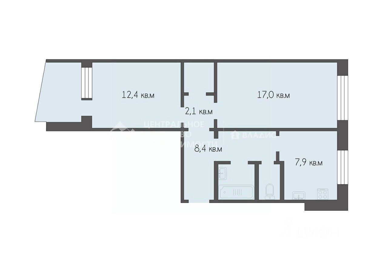 Общая площадь квартиры составляет 56,5 кв. м, жилая — 29,4 кв. м, площадь кухни — 7,9 кв. м. Две изолированные комнаты, высота потолков — 2,7 м. Есть видовая уютная лоджия и большая вместительная кладовка.