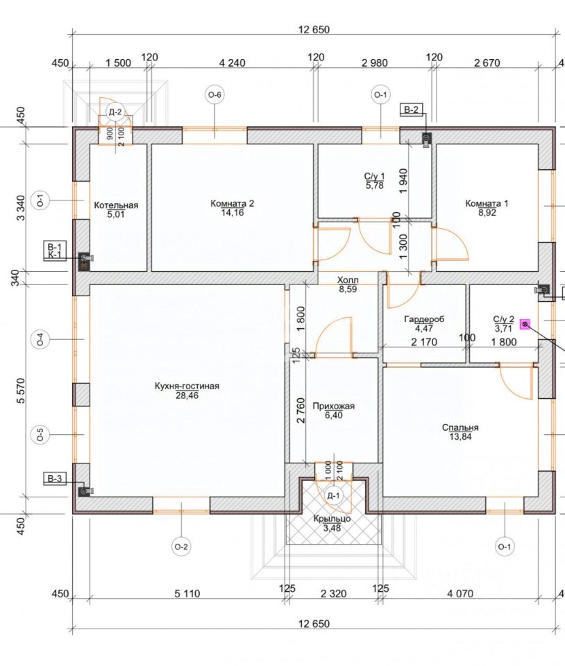 В доме имеются 3 комнаты площадью 14,16, 8,92 и 13,84 кв. м, 2 санузла (один расположен в смарт-спальне) и кухня-гостиная 28,46 кв. м, которая вместит всех. Стены дома выполнены из блока 400, насос заведен в скважину (переливная). Газ по границе участка, а стены дома — блок 400. Кровля — ПВХ мембрана, утеплённая на 200 мм, ЖБ плиты перекрытия.