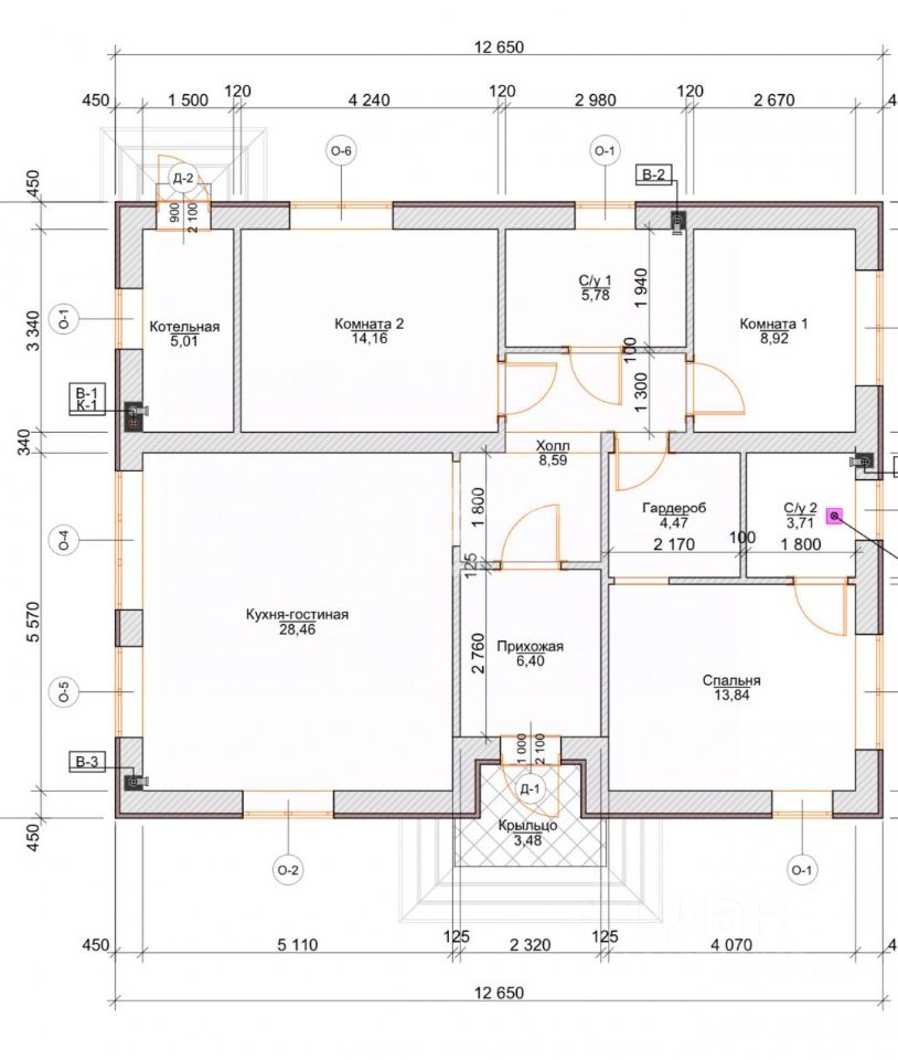 В доме имеются 3 комнаты площадью 14,16, 8,92 и 13,84 кв. м, 2 санузла (один расположен в смарт-спальне) и кухня-гостиная 28,46 кв. м, которая вместит всех. Стены дома выполнены из блока 400, насос заведен в скважину (переливная). Газ по границе участка, а стены дома — блок 400. Кровля — ПВХ мембрана, утеплённая на 200 мм, ЖБ плиты перекрытия. Черновой пол с утеплителем и толщина стены 640 мм, фундамент ленточный с заложением на 1,6 м — это позволит при необходимости достроить второй этаж. Несмотря на уединение, дом удобно расположен и имеет благоприятное расположение для расстановки парковочных мест.