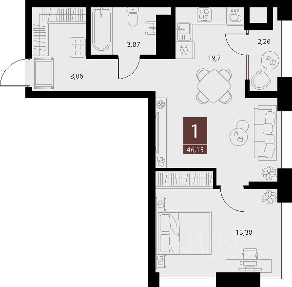 Общая площадь46,15 м2