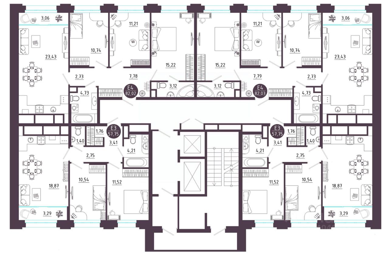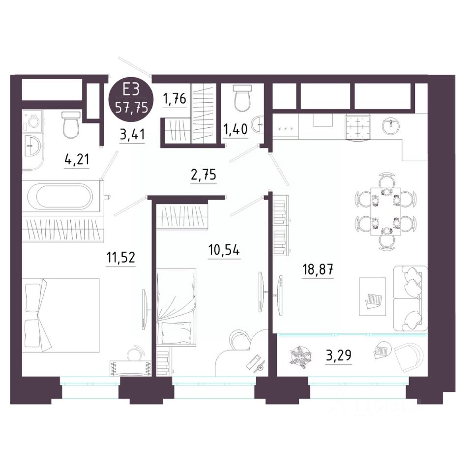 Общая площадь57,75 м2
