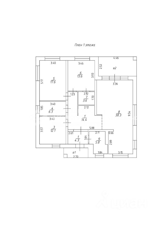 Общая площадь 107 кв.м. Большая кухня-гостиная 38,3 кв.м + 3 спальни (17,6+13,6+12,1 кв.м.), 2 санузла. Коммуникации: свет , вода - скважина - 17 метров, канализация - септик два кольца с бетонным дном. Газ заведен в дом, остается врезка - подключение.