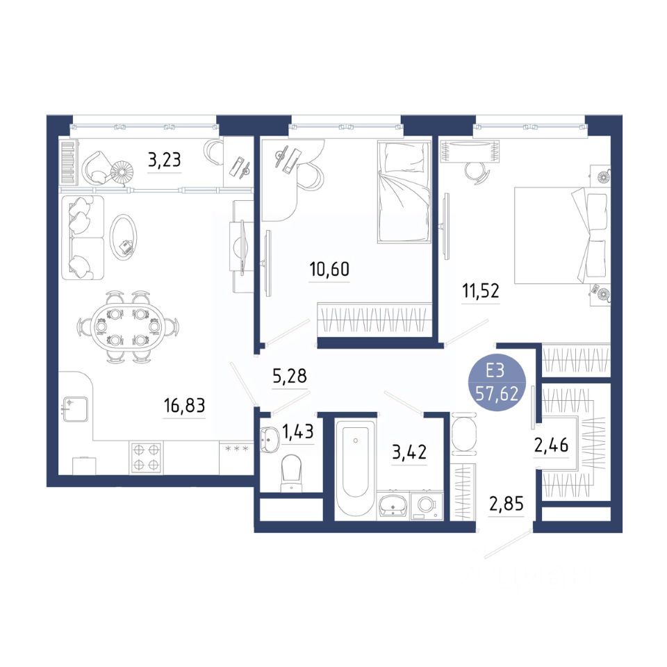 Общая площадь57,62 м2