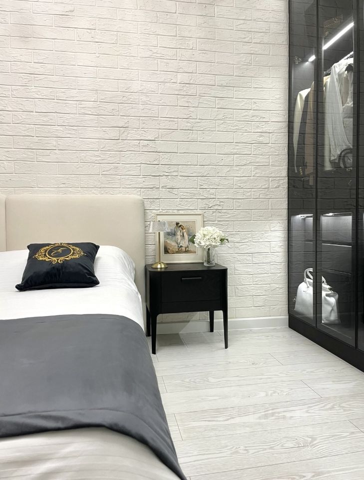 Мебель выполнена на заказ по индивидуальным эскизам из качественных материалов: • дизайнерский шкаф под потолок с затемнённым стеклом, алюминиевой рамкой в зоне дверей и подсветкой на каждой секции, • кровать с мягким изголовьем, каркасом из берёзы и массива хвойных пород, • вместительный трех-дверный зеркальный шкаф под потолок в коридоре, • готовое рабочее место с навесными шкафами для хранения в зоне лоджии, Также, прикроватные тумбы из натурального шпона ясеня.