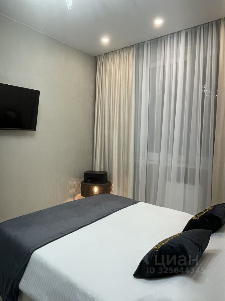 Функциональный кухонный гарнитур с вместительными шкафами, варочной панелью и техникой: соковыжималка, СВЧ, чайник с дополнительным подогреваемым заварочным чайником, холодильник, стиральная машина, телевизоры в каждой комнате. В зоне отдыха — роскошный двуспальный диван и телевизор.