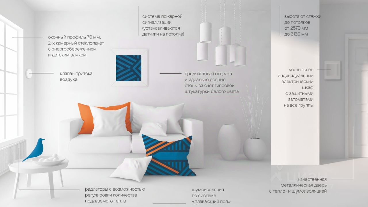 • детский сад 37 и детский центр ''Любознайка'' 5 минут пешком. БЕЗОПАСНЫЕ И КОМФОРТНЫЕ ДВОРЫ На территории дома предусмотрена наземная открытая парковка, прилегающая ко двору. Благодаря концепции ''двор без машин'' вы можете быть спокойны и за безопасность детей, и за свои автомобили. Для жителей мы благоустраиваем пешеходные зоны и велодорожки. На детских площадках будут установлены игровые комплексы и места для занятий спортом с использованием современного и экологичного оборудования. В настоящее время в комплексе действует контрольно-пропускной режим, въезд и выезд осуществляется через шлагбаум. В скором времени планируется возведение общего ограждения жилого комплекса со стороны частного сектора и озер. Снаружи и внутри дома установлена система видеонаблюдения. ПРЕДЧИСТОВАЯ ОТДЕЛКА КВАРТИР Все квартиры будут сданы с предчистовой отделкой, что позволит ускорить процесс ремонта, ведь вам не придется тратить время на дополнительные работы по выравниванию стен, полов и потолков. Для вашего комфорта предусмотрена шумоизоляция по системе ''плавающий пол'', благодаря которой не будет слышно посторонних звуков от соседей. Для дома предусмотрена отдельная крышная котельная, которая обеспечит автономность и независимость от централизованного отопления. Вы сможете самостоятельно регулировать температуру в квартире и экономить на коммунальных платежах.