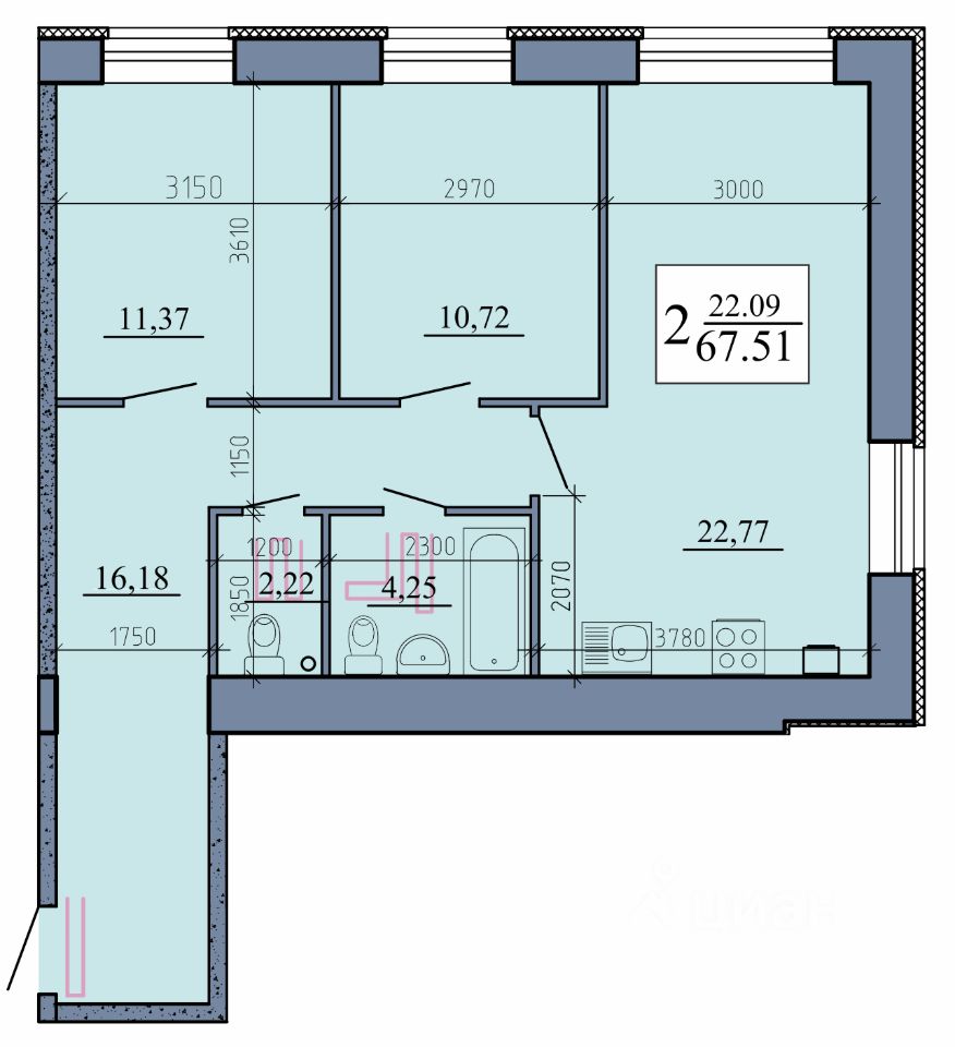 Шикарная кухня-гостиная 22.77 кв. м — место для вдохновения: от завтраков до вечеринок. Две изолированные комнаты (11.37 и 10.72 кв. м) создадут тихие уголки для отдыха.