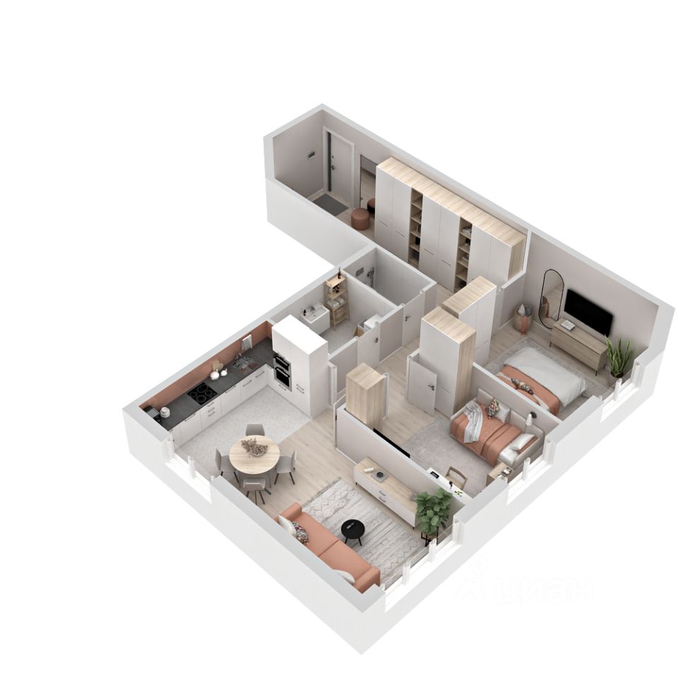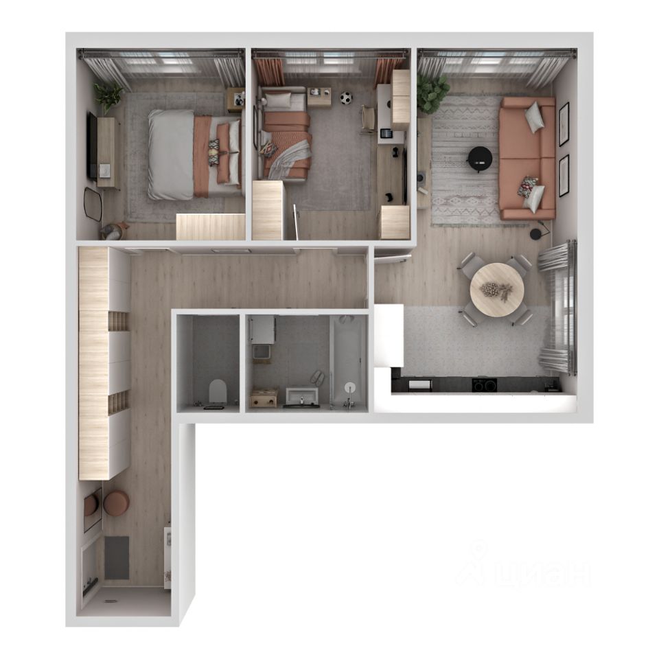 Шикарная кухня-гостиная 22.77 кв. м — место для вдохновения: от завтраков до вечеринок. Две изолированные комнаты (11.37 и 10.72 кв. м) создадут тихие уголки для отдыха.