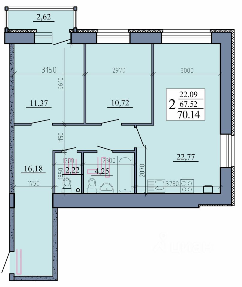 Общая площадь70,14 м2