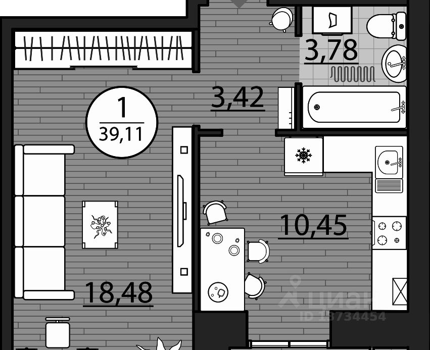 В продаже однокомнатная квартира площадью 39 м2 в современном жилом комплексе. Территория ЖК огорожена.