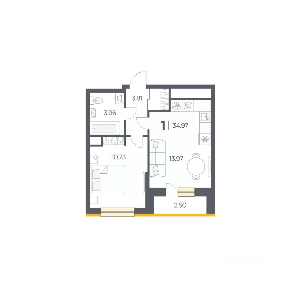 Общая площадь34,97 м2
