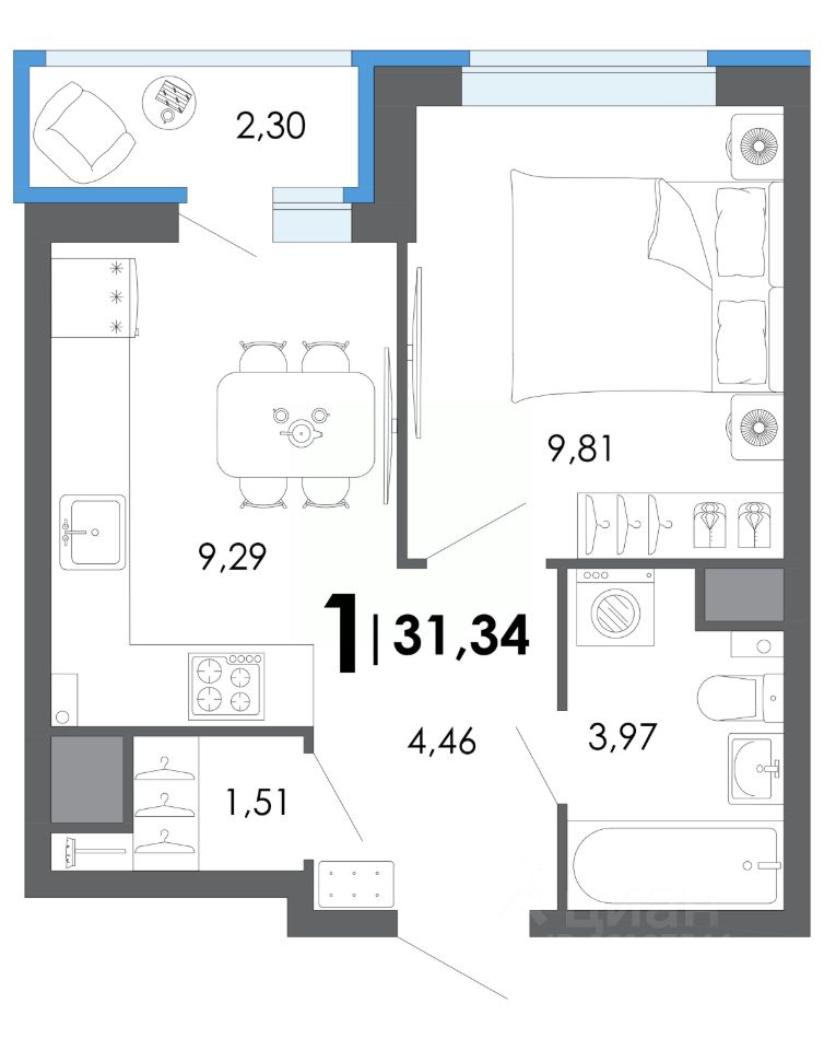 Общая площадь31,34 м2