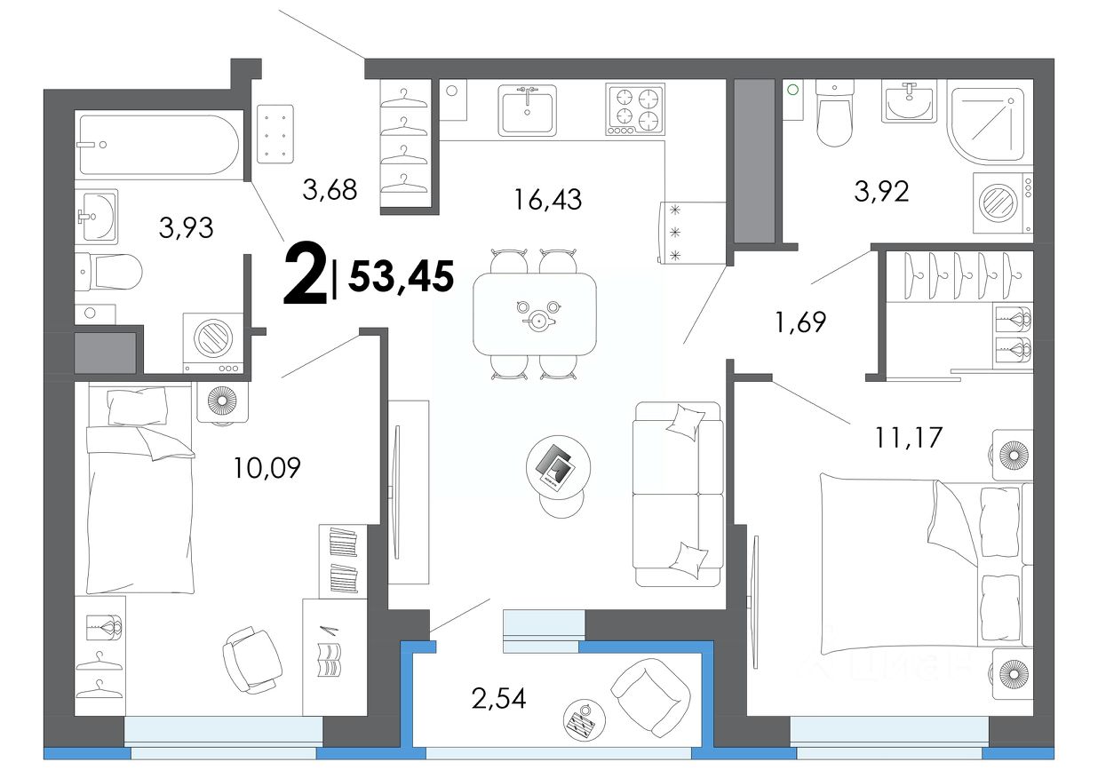 Общая площадь53,45 м2