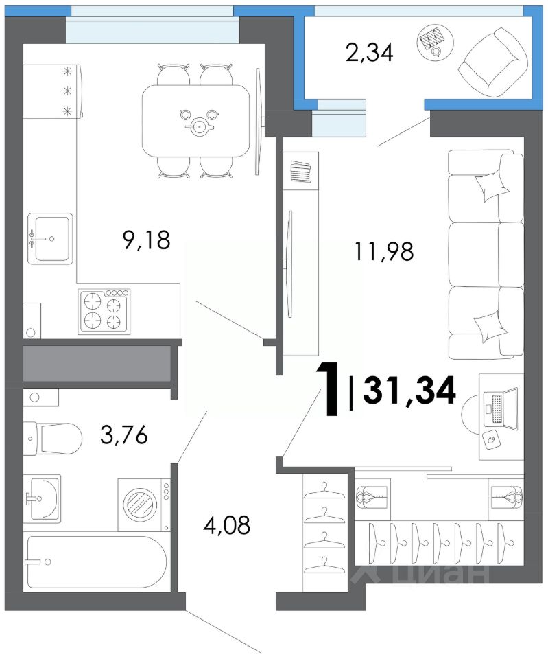 Общая площадь31,34 м2