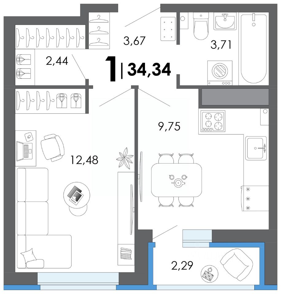 Общая площадь34,34 м2