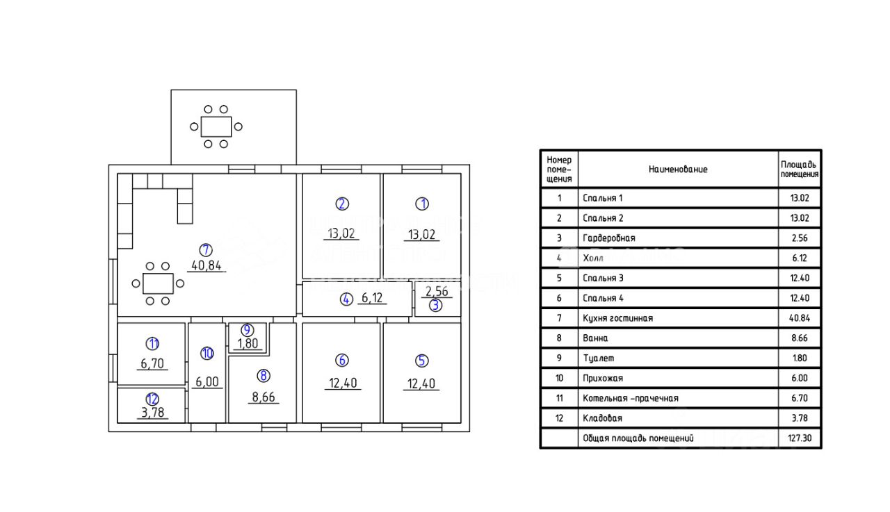 Дом общей площадью 127,3 м² Продуманная планировка для комфортной жизни: • 4 изолированные спальни (13,02 / 13,02 / 12,40 / 12,40 м²) • Просторная кухня-гостиная 40,84 м² — идеальное место для семейных ужинов и встреч с друзьями • Гардеробная • Холл • Ванная комната • Отдельный туалет • Котельная-прачечная • Кладовая • Удобная прихожая
